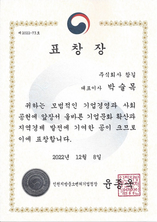 인천지방중소벤처기업청장 표창장 수상 및 인천경영포럼 송년의 밤 행사 참석 페이지 정보 작성자 최고관리자 작성일22-12-09 13:10 조회26,100회 댓글0건 관련링크 본문 인천지방중소벤처기업청장 표창장 수상 및 인천경영포럼 송년의 밤 행사 참석 댓글목록 등록된 댓글이 없습니다. 이전글 다음글 목록