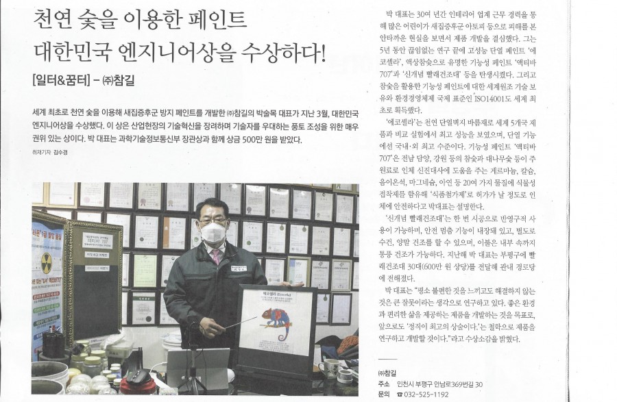 지역신문 부평사람들 게재 " 천연 숯을 이용한 페인트 대한민국 엔지니어상을 수상하다! " 페이지 정보 작성자 최고관리자 작성일21-04-28 15:57 조회32,533회 댓글0건 관련링크 본문 2021년4월25일 지역신문 부평사람들 게재 댓글목록 등록된 댓글이 없습니다. 이전글 다음글 목록